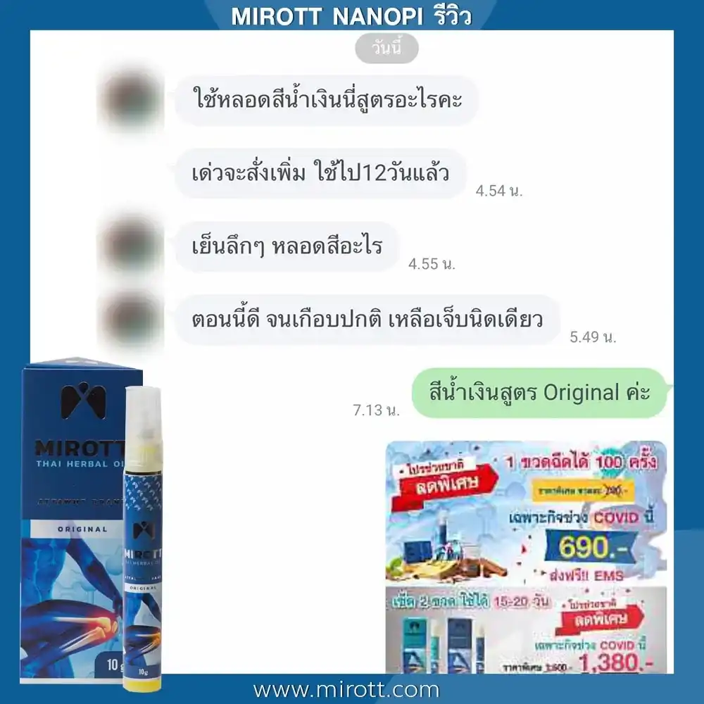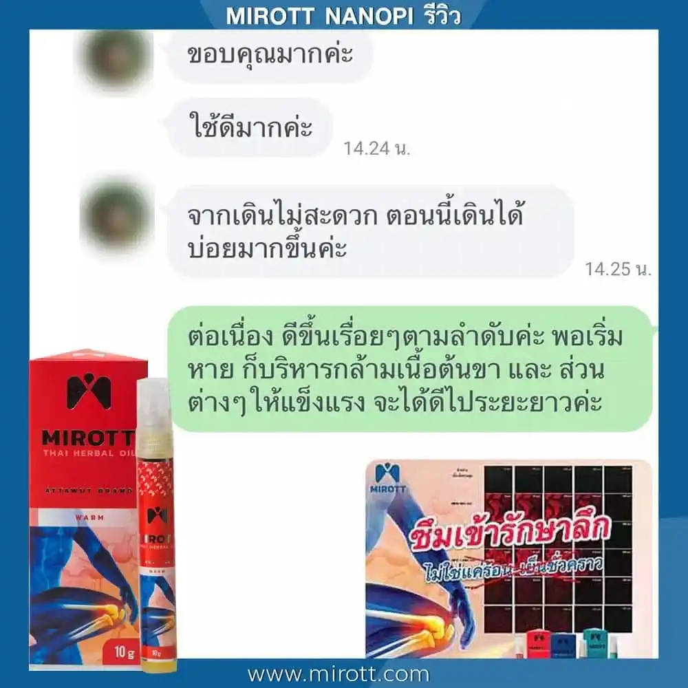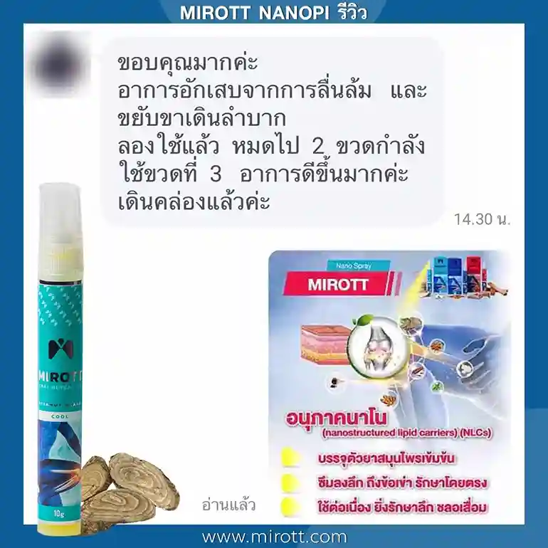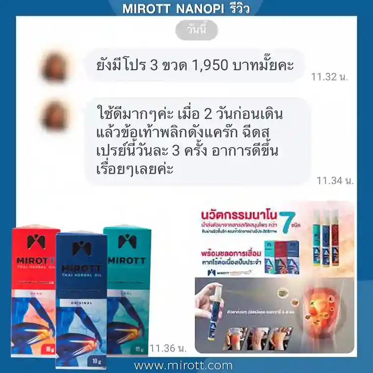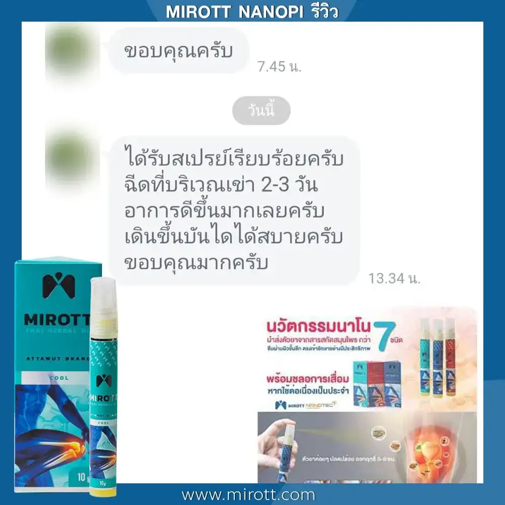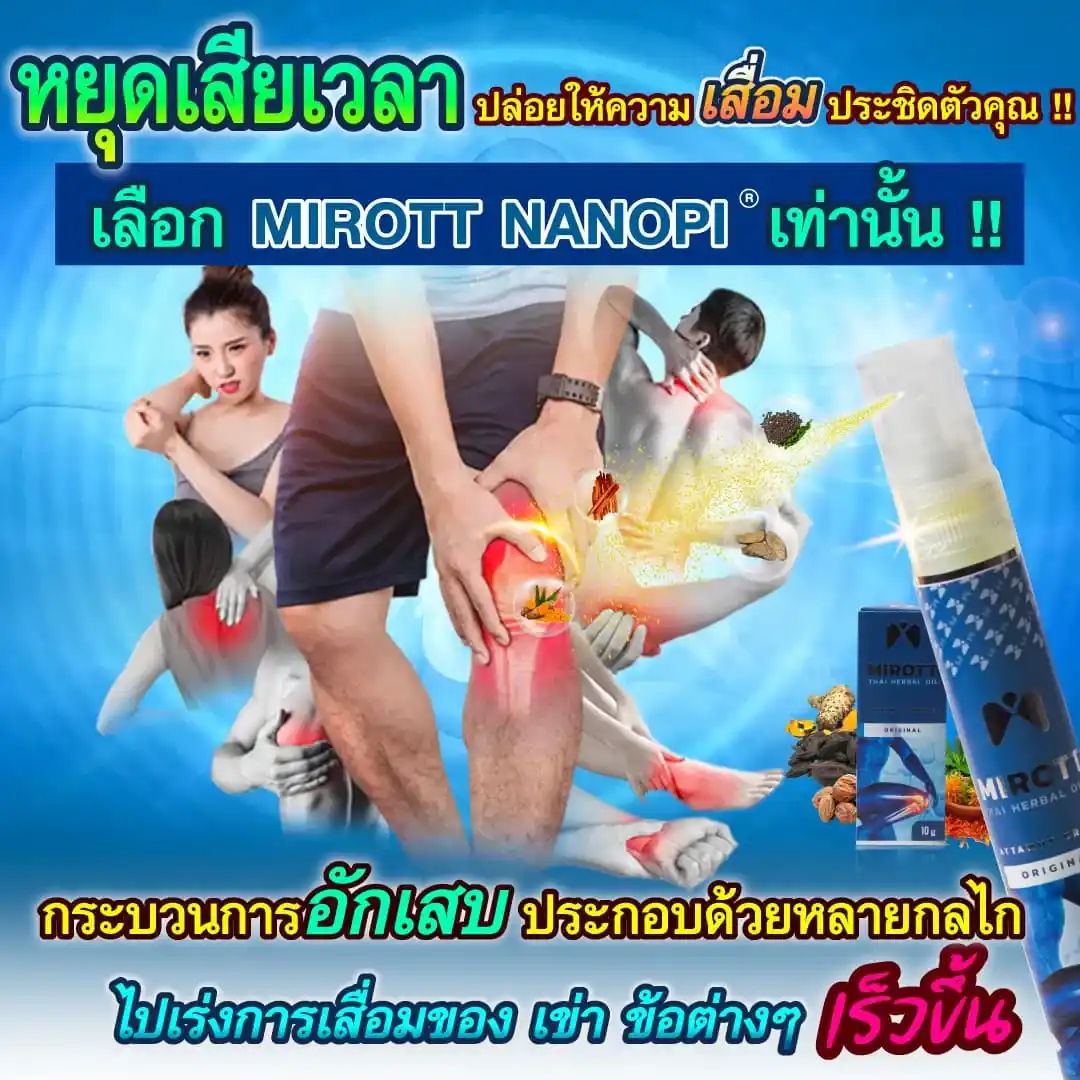 ประชาสัมพันธ์ ขาย ผลิตภัณฑ์ ประสบการณ์ ผู้ใช้งานจริง Mirott Nano Spray รักษาผิดวิธี เป็นปีก็ไม่หาย เจ็บเอ็น ยืดไม่ตรง ร้อนวูบวาบที่เข่า “หมอบอกว่าต้องทำใจ ทั้งกินยาอาหารเสริม กายภาพ อาการทรุดมาหลายเดือนบังเอิญเจอไมรอทในเน็ต อาการเจ็บดีขึ้น จนหายโดยไม่รู้ตัว รู้งี้สั่งมาใช้นานแล้ว” – ประชาสัมพันธ์ แนะนำผลิตภัณฑ์วิจัย ไมรอท – ผลลัพธ์ที่ได้ขึ้นอยู่กับแต่ละบุคคล เดินตรงไม่ได้ โคลงเคลง…หาหมอซ้ำแล้วไม่หาย “เริ่มต้น กินคอลลาเจน กินแล้วไม่ดีขึ้น เลยทดลองใช้ ไมรอท นาโน สเปรย์ฉีดทุกวัน เช้าเย็น 3 วัน อาการดีขึ้นจนเดินขึ้นบันไดได้” – ประชาสัมพันธ์ แนะนำผลิตภัณฑ์วิจัย ไมรอท – ผลลัพธ์ที่ได้ขึ้นอยู่กับแต่ละบุคคล แม่ลุกไม่ได้…ให้ลูกพยุง ข้อเสื่อม 1 ปี “หลังจากฉีดไมรอท 4 วัน แม่ก็ยืนได้แล้ว เดินได้เห็นได้ชัดเจนดีใจมาก ที่แม่ลุกเองได้” – ประชาสัมพันธ์ แนะนำผลิตภัณฑ์วิจัย ไมรอท – ผลลัพธ์ที่ได้ขึ้นอยู่กับแต่ละบุคคล ขอบคุณเสียงลูกค้า รีวิว จาก Pantip Mirott nano spray ดีไหม ? พันทิป รีวิว Mirott Nano Spary จากสมาชิกหมายเลข 7982542https://pantip.com/topic/35805650 พันทิป รีวิว Mirott Nano Spary จากสมาชิกหมายเลข 7982738https://pantip.com/topic/35354705 เสียงตอบรับจากผู้ใช้จริง ขอขอบคุณ สำหรับความไว้วางใจ ที่ให้ไมรอทดูแล พร้อมเดินเคียงข้าง เพราะลูกค้าคือคนสำคัญ กลับมาเดินได้ เพียงฉีดแล้วตบ ใครๆก็แนะนำ ประชาสัมพันธ์ ขาย ผลิตภัณฑ์ ผลลัพธ์อาจเปลี่ยนแปลงไปแล้วแต่บุคคล ประชาสัมพันธ์ ขาย ผลิตภัณฑ์ ผลลัพธ์อาจเปลี่ยนแปลงไปแล้วแต่บุคคล ประชาสัมพันธ์ ขาย ผลิตภัณฑ์ ผลลัพธ์อาจเปลี่ยนแปลงไปแล้วแต่บุคคล จิ๋วแต่แจ๋ว กลับมาเดินได้ ห้ามพลาด โปรสุดพิเศษ !! เซตคู่หู่ ไมรอท+กษัยเส้น ตรีโลก หากเสื่อมไปมาก ชา ยิบๆ ซ่าๆ สูตรตำรับเฉพาะโดยหมออรรถวุฒิ บริการยุคใหม่ ขายทางออนไลน์ ใหม่สด ส่งถึงบ้านอย่างรวดเร็ว สั่งซื้อได้เลย ราคาโปรโมชั่นก่อนจะหมดเวลา !! ประชาสัมพันธ์ ขาย ผลิตภัณฑ์ ประชาสัมพันธ์ ขาย ผลิตภัณฑ์ เหมาะกับใคร ? ปวดเข่าเมื่อ ขึ้น/ลง บันได ปวดเข่า เมื่อนั่งเวลานานๆ ปวดแบบร้อนแสบ ในเข่า มีเสียงดัง เมื่อเคลื่อนไหวข้อเข่า ข้อเข่าโค้งงอ หรืองอได้ไม่สบาย ข้อเข่าแข็งตึง ชา ขยับแล้วติดขัด กระโดดแล้วเจ็บจี๊ดๆ ที่เข่า ประชาสัมพันธ์ ขาย ผลิตภัณฑ์ เหนือกว่าทุกการรักษา ด้วยนวัตกรรมเซลล์จิ๋ว !! พลัง 7 สมุนไพรเซลล์จิ๋ว แท้ 1 เดียว NANOPI นำส่งตัวยา ซึมเข้ารักษาลึกที่ต้นตอ*โดยไม่ต้องกินยา* กระบวนการผลิตมาตรฐานสูง ดูแลโดยทีมผู้เชี่ยวชาญ แพทย์แผนไทยและเภสัชกร วิจัยแท้ 1 เดียว ต้อง MIROTT NANOPI เท่านั้น ! ประชาสัมพันธ์ ขาย ผลิตภัณฑ์ ประชาสัมพันธ์ ขาย ผลิตภัณฑ์