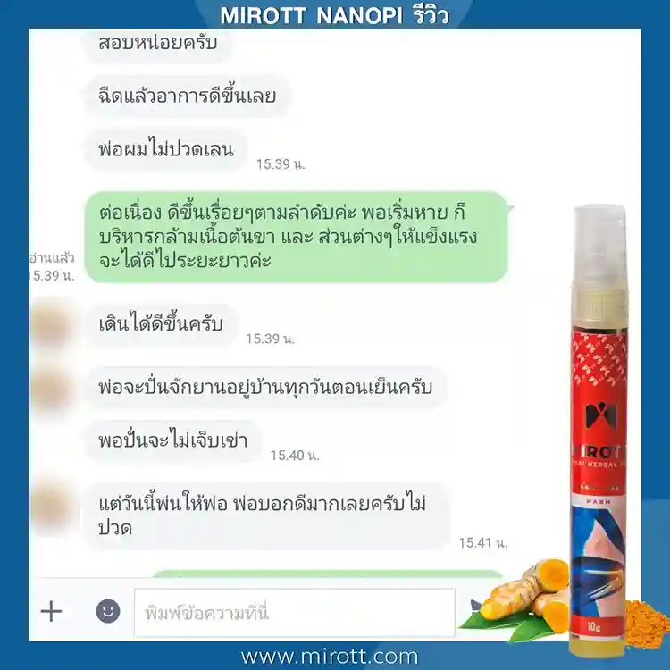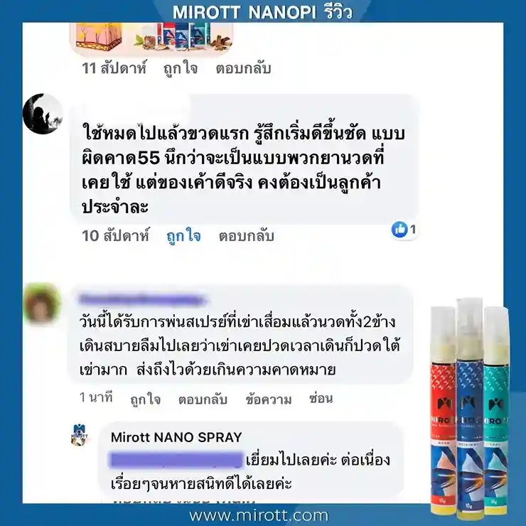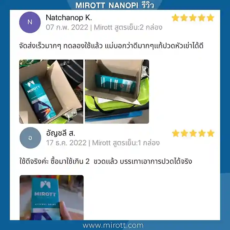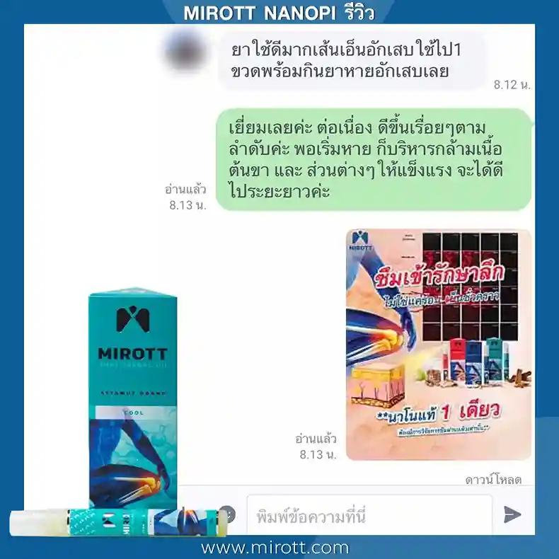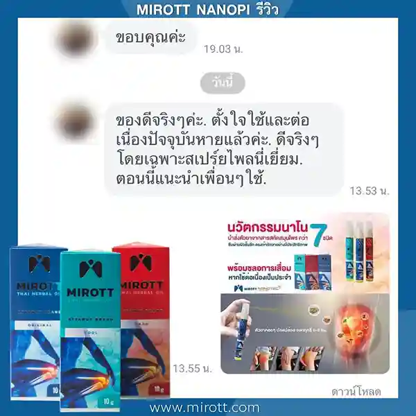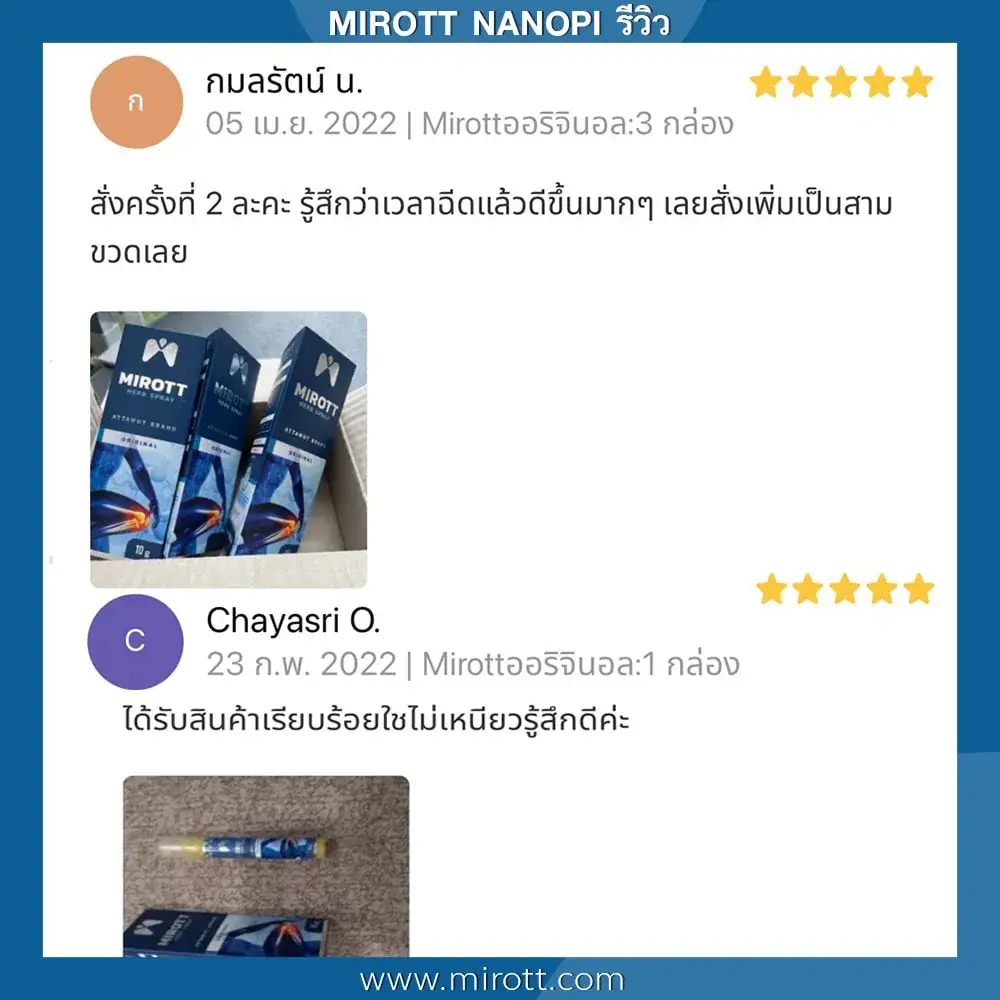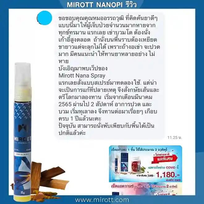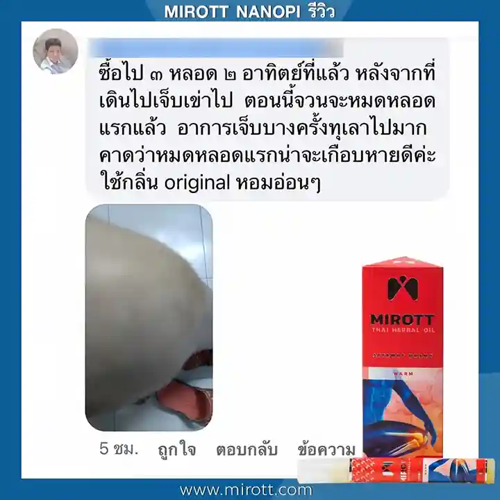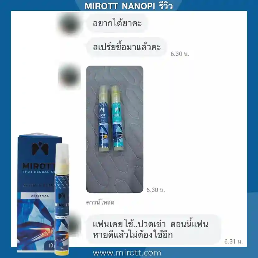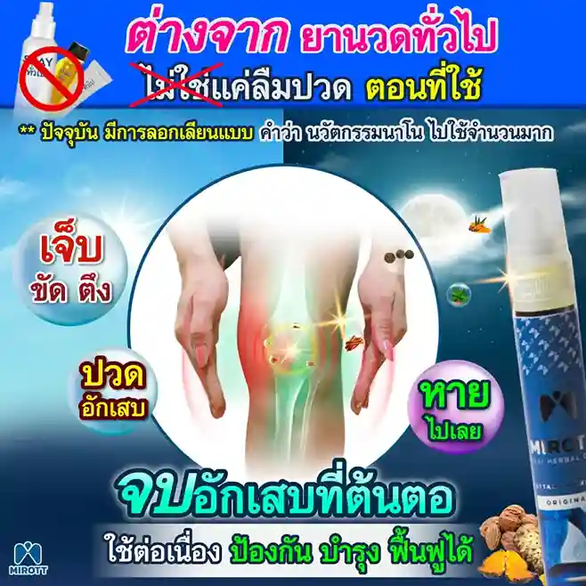 ประชาสัมพันธ์ ขาย ผลิตภัณฑ์ ประสบการณ์ ผู้ใช้งานจริง Mirott Nano Spray รักษาผิดวิธี เป็นปีก็ไม่หาย เจ็บเอ็น ยืดไม่ตรง ร้อนวูบวาบที่เข่า “หมอบอกว่าต้องทำใจ ทั้งกินยาอาหารเสริม กายภาพ อาการทรุดมาหลายเดือนบังเอิญเจอไมรอทในเน็ต อาการเจ็บดีขึ้น จนหายโดยไม่รู้ตัว รู้งี้สั่งมาใช้นานแล้ว” – ประชาสัมพันธ์ แนะนำผลิตภัณฑ์วิจัย ไมรอท – ผลลัพธ์ที่ได้ขึ้นอยู่กับแต่ละบุคคล เดินตรงไม่ได้ โคลงเคลง…หาหมอซ้ำแล้วไม่หาย “เริ่มต้น กินคอลลาเจน กินแล้วไม่ดีขึ้น เลยทดลองใช้ ไมรอท นาโน สเปรย์ฉีดทุกวัน เช้าเย็น 3 วัน อาการดีขึ้นจนเดินขึ้นบันไดได้” – ประชาสัมพันธ์ แนะนำผลิตภัณฑ์วิจัย ไมรอท – ผลลัพธ์ที่ได้ขึ้นอยู่กับแต่ละบุคคล แม่ลุกไม่ได้…ให้ลูกพยุง ข้อเสื่อม 1 ปี “หลังจากฉีดไมรอท 4 วัน แม่ก็ยืนได้แล้ว เดินได้เห็นได้ชัดเจนดีใจมาก ที่แม่ลุกเองได้” – ประชาสัมพันธ์ แนะนำผลิตภัณฑ์วิจัย ไมรอท – ผลลัพธ์ที่ได้ขึ้นอยู่กับแต่ละบุคคล ขอบคุณเสียงลูกค้า รีวิว จาก Pantip Mirott nano spray ดีไหม ? พันทิป รีวิว Mirott Nano Spary จากสมาชิกหมายเลข 7982542https://pantip.com/topic/35805650 พันทิป รีวิว Mirott Nano Spary จากสมาชิกหมายเลข 7982738https://pantip.com/topic/35354705 เสียงตอบรับจากผู้ใช้จริง ขอขอบคุณ สำหรับความไว้วางใจ ที่ให้ไมรอทดูแล พร้อมเดินเคียงข้าง เพราะลูกค้าคือคนสำคัญ กลับมาเดินได้ เพียงฉีดแล้วตบ ใครๆก็แนะนำ ประชาสัมพันธ์ ขาย ผลิตภัณฑ์ ผลลัพธ์อาจเปลี่ยนแปลงไปแล้วแต่บุคคล ประชาสัมพันธ์ ขาย ผลิตภัณฑ์ ผลลัพธ์อาจเปลี่ยนแปลงไปแล้วแต่บุคคล ประชาสัมพันธ์ ขาย ผลิตภัณฑ์ ผลลัพธ์อาจเปลี่ยนแปลงไปแล้วแต่บุคคล จิ๋วแต่แจ๋ว กลับมาเดินได้ ห้ามพลาด โปรสุดพิเศษ !! เซตคู่หู่ ไมรอท+กษัยเส้น ตรีโลก หากเสื่อมไปมาก ชา ยิบๆ ซ่าๆ สูตรตำรับเฉพาะโดยหมออรรถวุฒิ บริการยุคใหม่ ขายทางออนไลน์ ใหม่สด ส่งถึงบ้านอย่างรวดเร็ว สั่งซื้อได้เลย ราคาโปรโมชั่นก่อนจะหมดเวลา !! ประชาสัมพันธ์ ขาย ผลิตภัณฑ์ ประชาสัมพันธ์ ขาย ผลิตภัณฑ์ เหมาะกับใคร ? ปวดเข่าเมื่อ ขึ้น/ลง บันได ปวดเข่า เมื่อนั่งเวลานานๆ ปวดแบบร้อนแสบ ในเข่า มีเสียงดัง เมื่อเคลื่อนไหวข้อเข่า ข้อเข่าโค้งงอ หรืองอได้ไม่สบาย ข้อเข่าแข็งตึง ชา ขยับแล้วติดขัด กระโดดแล้วเจ็บจี๊ดๆ ที่เข่า ประชาสัมพันธ์ ขาย ผลิตภัณฑ์ เหนือกว่าทุกการรักษา ด้วยนวัตกรรมเซลล์จิ๋ว !! พลัง 7 สมุนไพรเซลล์จิ๋ว แท้ 1 เดียว NANOPI นำส่งตัวยา ซึมเข้ารักษาลึกที่ต้นตอ*โดยไม่ต้องกินยา* กระบวนการผลิตมาตรฐานสูง ดูแลโดยทีมผู้เชี่ยวชาญ แพทย์แผนไทยและเภสัชกร วิจัยแท้ 1 เดียว ต้อง MIROTT NANOPI เท่านั้น ! ประชาสัมพันธ์ ขาย ผลิตภัณฑ์ ประชาสัมพันธ์ ขาย ผลิตภัณฑ์